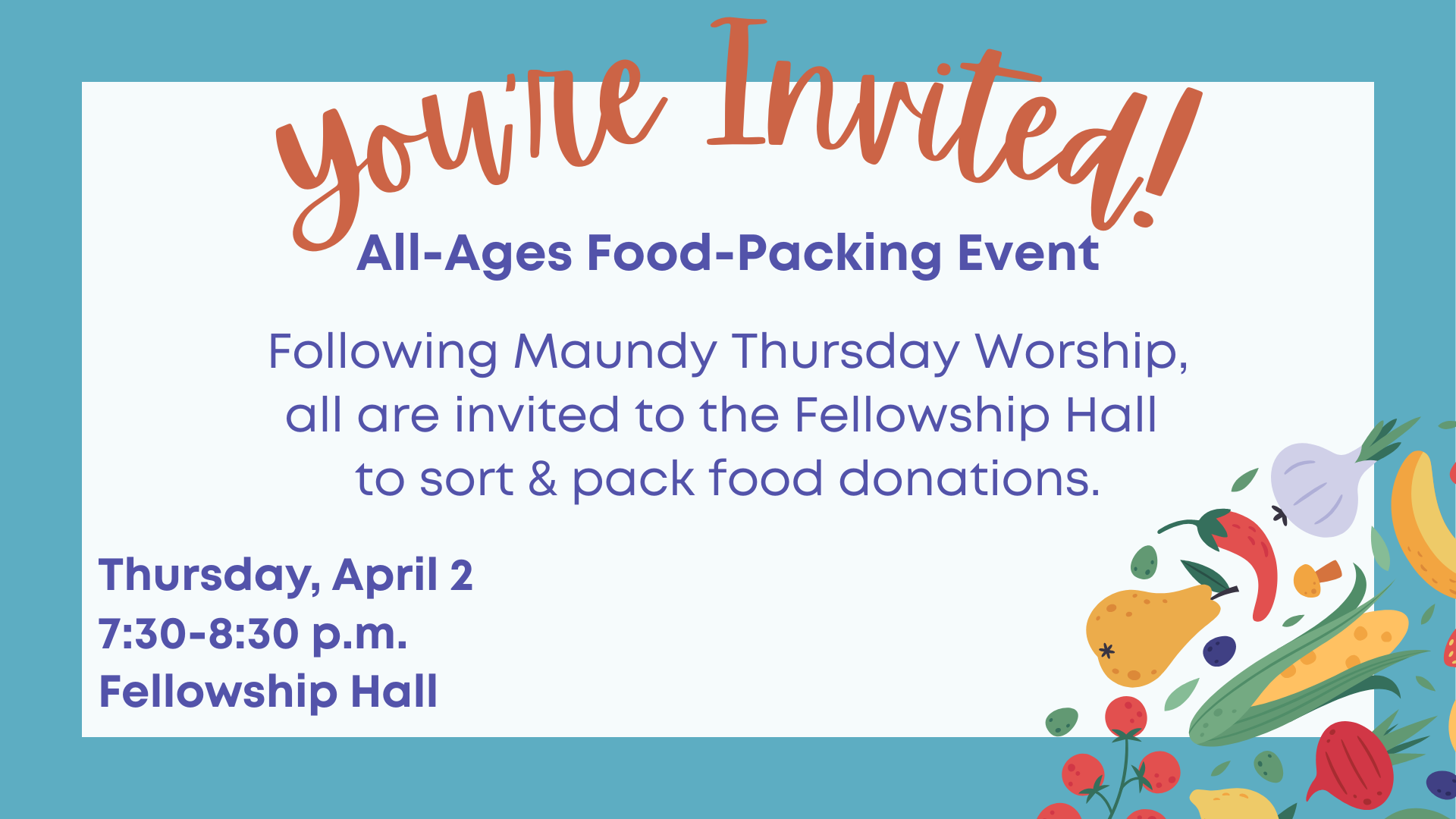 All are invited to come pack and sort food following worship on Maundy Thursday.