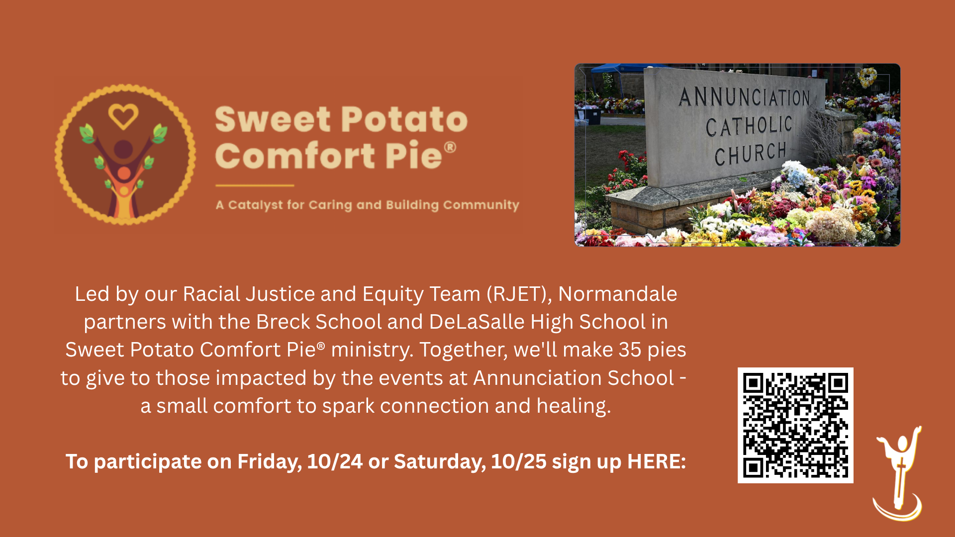 Led by our Racial Justice and Equity Team (RJET), Normandale partners with the Breck School and DeLaSalle High School in Sweet Potato Comfort Pie® ministry. Together, we’ll make 35 pies to give to those impacted by the events at Annunciation School – a small comfort to spark connection and healing.