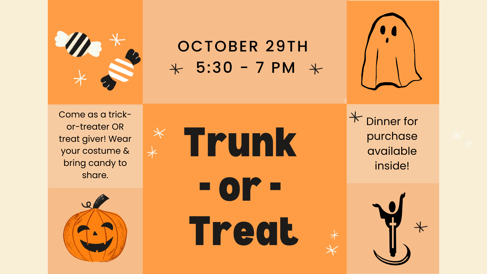 Trunks may set up beginning at 4:30pm; trick-or-treating begins at 5PM. A special, family friendly, meal will be served during this event.